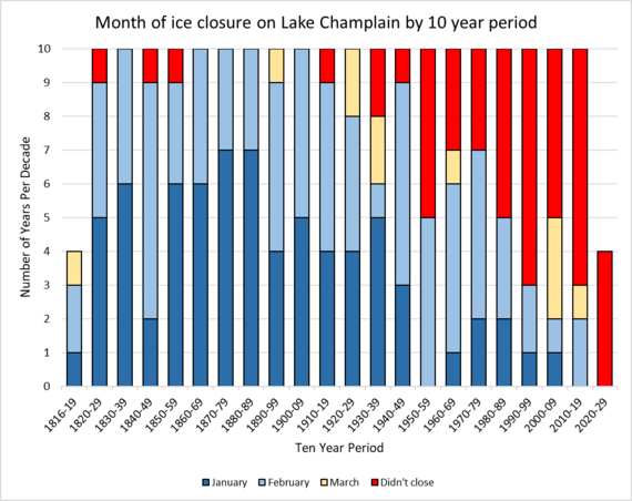As the charts show, the 1950s appear to be the turning point when Lake Champlain experienced not only a greater frequency of freezing later in the year – in mid-February or early March – but of ice not closing at all. Lake Champlain hasn’t frozen over in January since 2004. March of 2019 represents the first time the lake has frozen over completely in the past four years.
