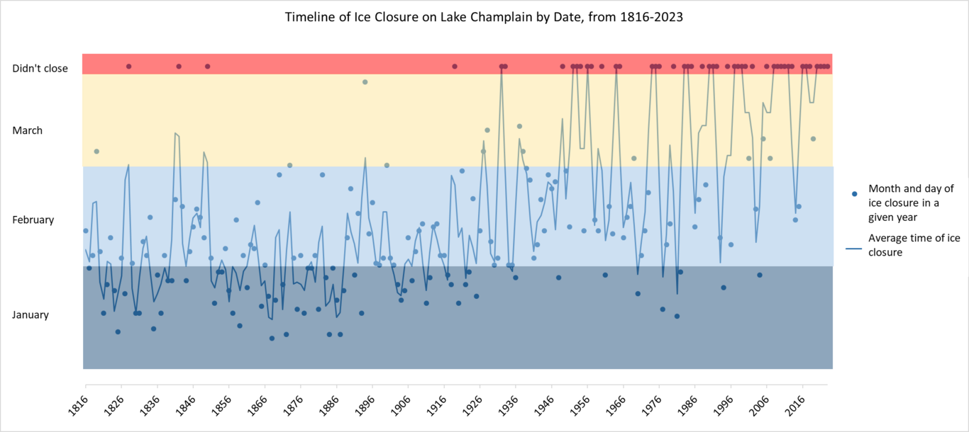 The trendline zig-zagging down the center of the chart reveals how quickly the average date of ice closure has changed in recent decades. Between the early 1800s and the early 1900s the lake typically froze over in January and early February, and the trendline rarely leaves those months. However, as time went on Lake Champlain began freezing later and later in the year. In the early 1900s the average date of ice closure moved into February, and in the 1950s it peaked closer to March. Beginning in the 1990s Lake Champlain became more likely not to freeze over at all.