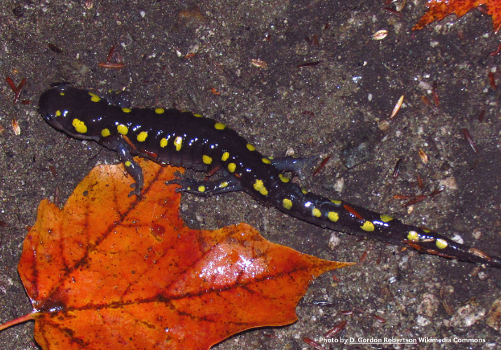 This is not the only method. Other frogs such as spring peepers (Pseudacris crucifer) and wood frogs (Lithobates sylvaticus) as well as “mole salamanders”—a group of salamander species unique to North America with a tendancy to burrow underground—including Jefferson salamanders (Ambystoma jeffersonianum), blue-spotted salamanders (Ambystoma laterale), and the iconic spotted salamander (Ambystoma maculatum) employ a different strategy. They all overwinter in wooded upland areas: the mole salamanders tucked deep underground beneath the frost line, spring peepers a bit shallower in mud and duff, and wood frogs in the upper layers of the forest floor where their bodies freeze solid for up to eight months.
