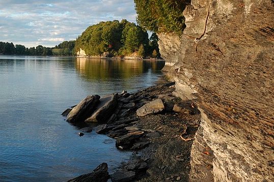 The New York shoreline from the vicinity of Port Kent south is “basement” rock, part of an ancient range of mountains that pre-dated the Adirondacks. Though the Adirondack Mountains themselves formed a mere 20 million years ago, these rocks are over one billion years old!