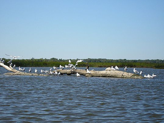 Most visible are the birds that fly and hunt over the water. Over 250 species can be found within the Lake Champlain Basin in a given year. Four species of gulls are regularly seen on the lake. Most common and familiar are the ubiquitous ring-billed gulls and the larger herring gulls. A few massive great black-backed gulls can be seen year round, while small dainty tern-like Bonaparte's gulls are seen most frequently in the spring and fall. Double-crested cormorants hunt throughout the lake during the summer; this now common species was first reported nesting on the lake in the early 1980s. Bald eagles and osprey soar about. Common and Caspian terns breed on islands. Wading birds that stalk the shorelines and weedy areas include great blue herons, green herons, American bitterns, black-crowned night herons, and, more recently, great egrets. The most frequently sighted duck species are common mergansers, a diving duck, and mallards and wood ducks, both puddle ducks. During the winter, large rafts of common goldeneye float on calm water.